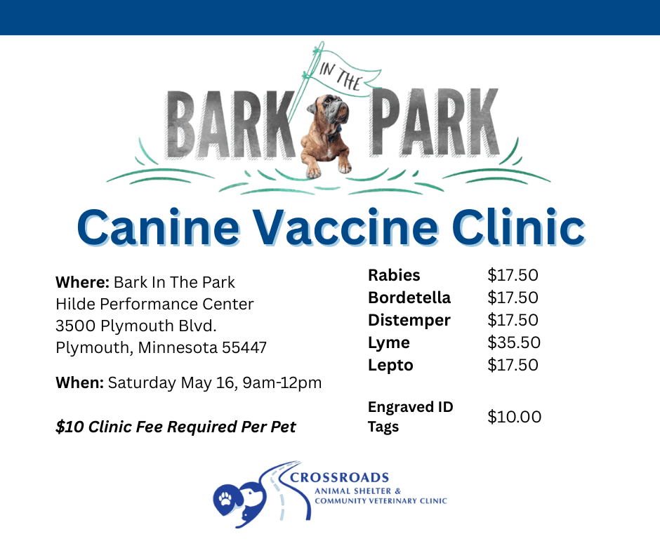 In line with our mission to expand access to preventative care and wellness, the Crossroads Veterinary team will host a Vaccine Clinic at Spikes & Houles in Maple Plain. This event is outdoors, and is geared towards canines. A $10 clinic fee per pet is required.
